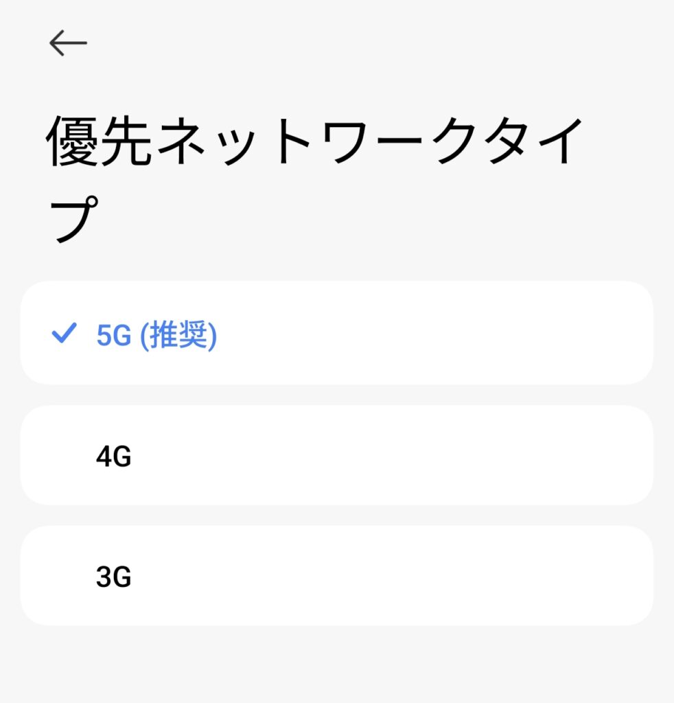 一般的には 「5G/4G/3G自動」 や 「4G/3G自動」 などが用意されていますが、この設定次第でネットの繋がりやすさが大きく変わることがあります