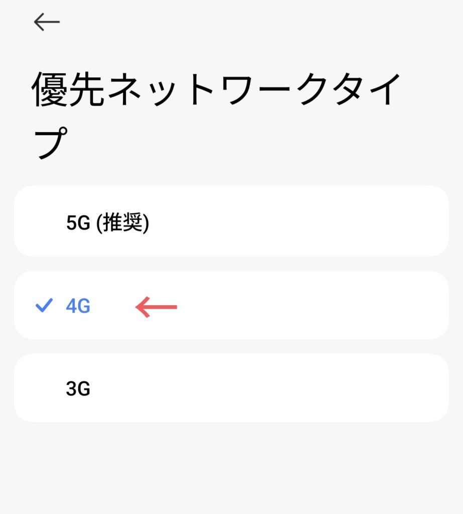 と感じるなら、優先ネットワークを「4G」に固定するのがおすすめです。